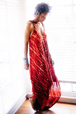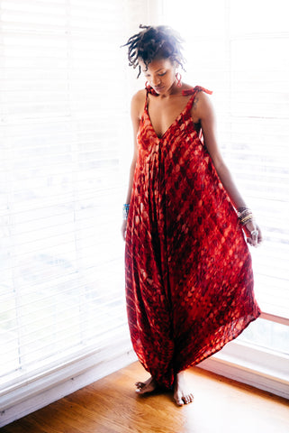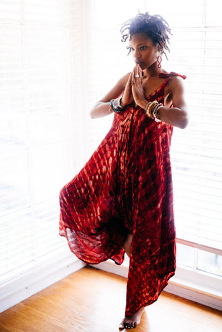 Beautifully hand dyed romper featuring a bold red and soft cream pattern with a flowy, effortless fit. Ultra dramatic wide leg shape and openings...